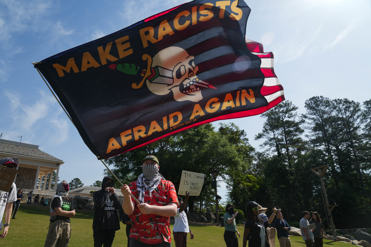 Demonstrators stand in protest against the Sons of the Confederate Veterans annual Memorial Day at Stone Mountain Park on April 19, 2025 in Stone Mountain, Georgia.