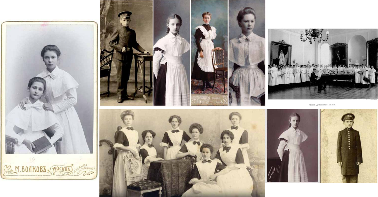 The Russian school uniform was modeled on military attire and carried a different symbolism than in Britain. Rather than signaling poverty, it marked status. Only families who were wealthy enough could send their children to gymnasiums, and the uniform became a visible badge of belonging to the educated class.