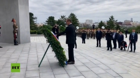 During his stay, Medvedev laid a wreath at the Liberation Monument in Pyongyang in honor of Soviet soldiers who died fighting Japanese forces in 1945 and placed flowers at the statues of the late North Korean leaders Kim Il-sung and Kim Jong-il.