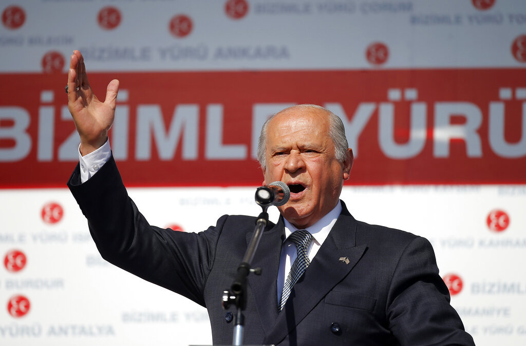 Devlet Bahceli, leader of the Nationalist Action Party, MHP, addresses an election rally in Istanbul, Turkey, Sunday, May 31, 2015.