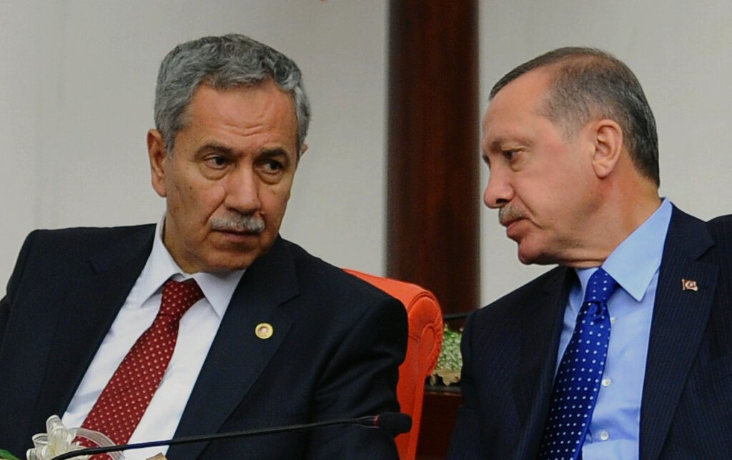 Recep Tayyip Erdogan, right, and Bulent Arinc are seen at Turkey’s parliament in Ankara, Turkey