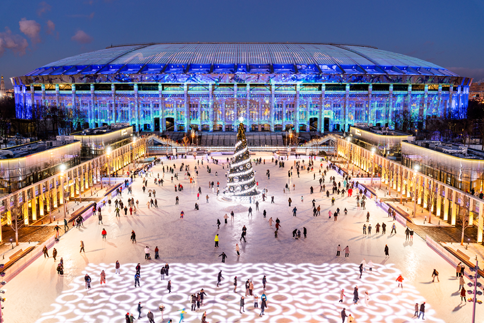 At Luzhniki, a vast open-air skating rink unfolds across 16,000 square meters, accommodating up to 3,000 skaters at a time and functioning as a full multimedia environment, with 3D projections, interactive installations, a performance stage, and a towering digital Christmas tree, all framed by a ring of winter food halls and cafés.