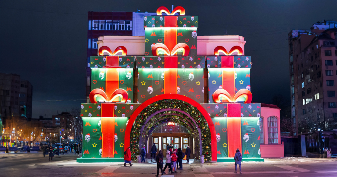 Eastward, the Semyonovskaya metro station stands wrapped like a festal gift, enlarged to the measure of the city. Color and light beckon wayfarers of every age, transforming ordinary transit into a playful interlude of wonder along the winter route.