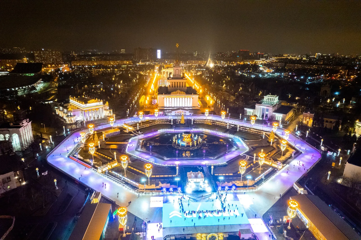 Further north, VDNKh unveils Europe’s largest artificial rink, an expansive 20,500-square-metre tapestry of glassy ice, threaded with light and leisure. The surface is composed into distinct thematic zones, where children’s circles, softly illuminated bridges, and glowing art objects create a measured equilibrium between exuberant play and contemplative winter beauty beneath the open sky.