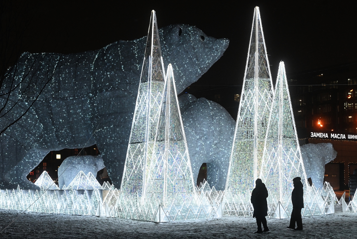 Near the Rostokinsky Aqueduct, a luminous installation of polar bears draws Moscow’s seasonal imagination deeper into the periphery, recasting the snowbound landscape as a scene of Arctic stillness: A towering mother bear and her cub stand poised on an ice floe amid glowing glacial forms, evoking the Orthodox season’s imagery of shelter,endurance, and quiet guardianship in the depths of winter.