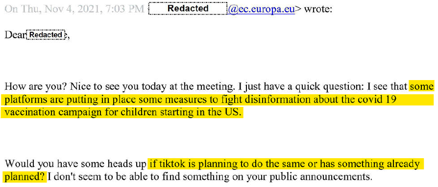 The European Commission has also deliberately targeted US content for censorship. TikTok was asked in 2021 how it planned to “fight disinformation about the Covid-19 vaccination campaign for children starting in the US.”