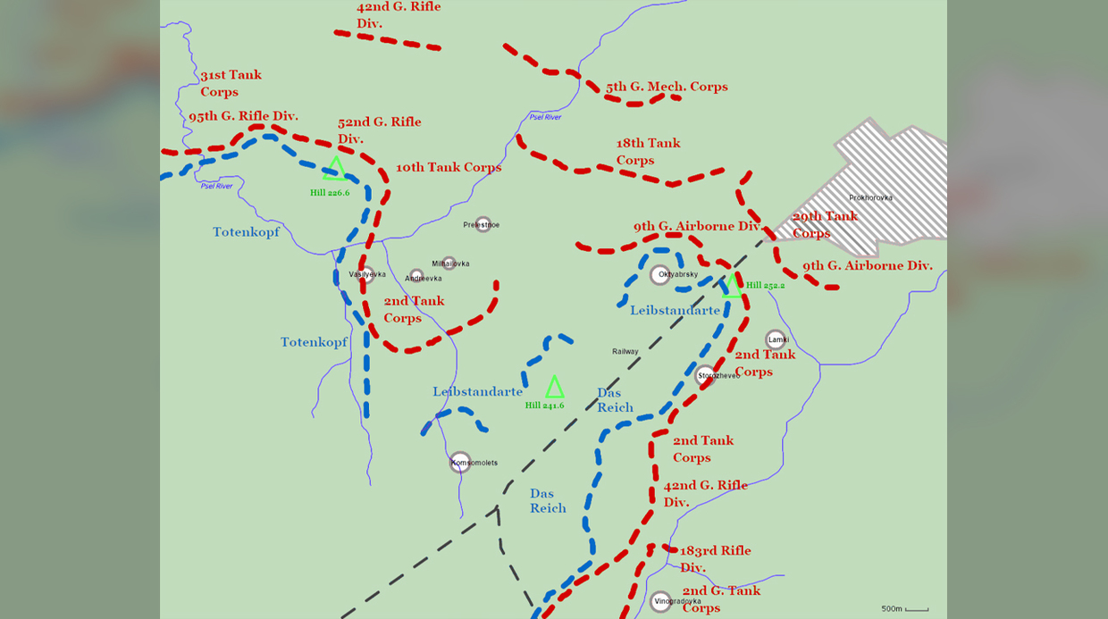 To stop the German breakthrough, Soviet high command deployed its main reserve: the 5th Guards Tank Army under General Pavel Rotmistrov. It was rushed forward in a forced march of nearly 300 kilometers to launch a counterattack against the elite II SS Panzer Corps, commanded by Paul Hausser. His forces included the best of the Waffen SS – the Leibstandarte Adolf Hitler, Das Reich, and Totenkopf divisions.