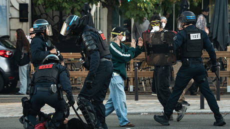 In Paris, police fired tear gas outside Gare du Nord train station, where around a thousand protesters gathered, some holding signs declaring Wednesday a ‘public holiday’. In Nantes, demonstrators set tires and bins ablaze to block a highway before being dispersed with gas. In Montpellier, scuffles erupted as protesters erected barricades, with one banner demanding ‘Macron resign’.