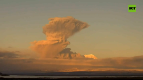 A volcanic eruption on the Kamchatka Peninsula in Russia’s Far East has sent a massive plume of ash high into the sky, which has traveled dozens of kilometers away from the site, prompting aviation warnings in the region.